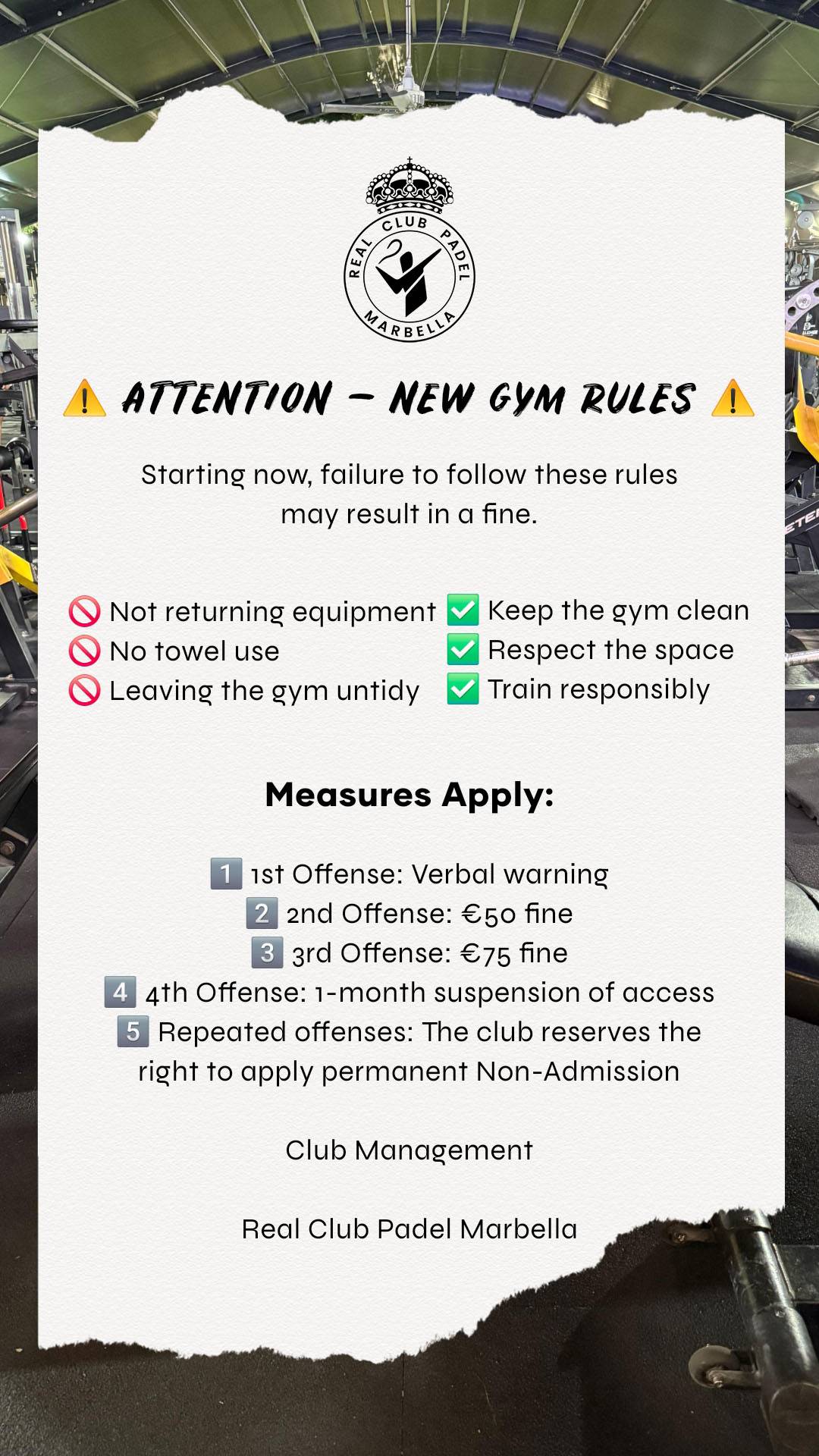 With the aim of improving the experience for all members and ensuring a clean, safe, and respectful environment, we have implemented a new rules enforcement system within our facilities.